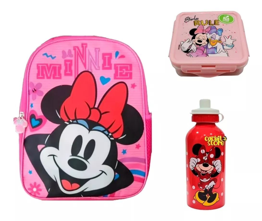 FANTASTICO Y COMPLETO PACK MINNIE MOUSE INCLUYE: Mochila Minnie Mouses (30x30x15) Botella Aluminio Hermetico para sandwiches TODO ORIGINAL MARCA DISNEY!!! NO TE DEJES ENGAÑAR!! Según las políticas de Mercado Libre, usted dispone solo de 30 días para realizar un reclamo únicamente por DEFECTO DE FÁBRICA, no por negligencia al utilizar el producto o por arrepentimiento de compra. Cabe destacar que el cliente debe contar con la caja original del producto para poder hacer la devolución, de lo contrario no corre la garantía (Ley de Protección al Consumidor).
